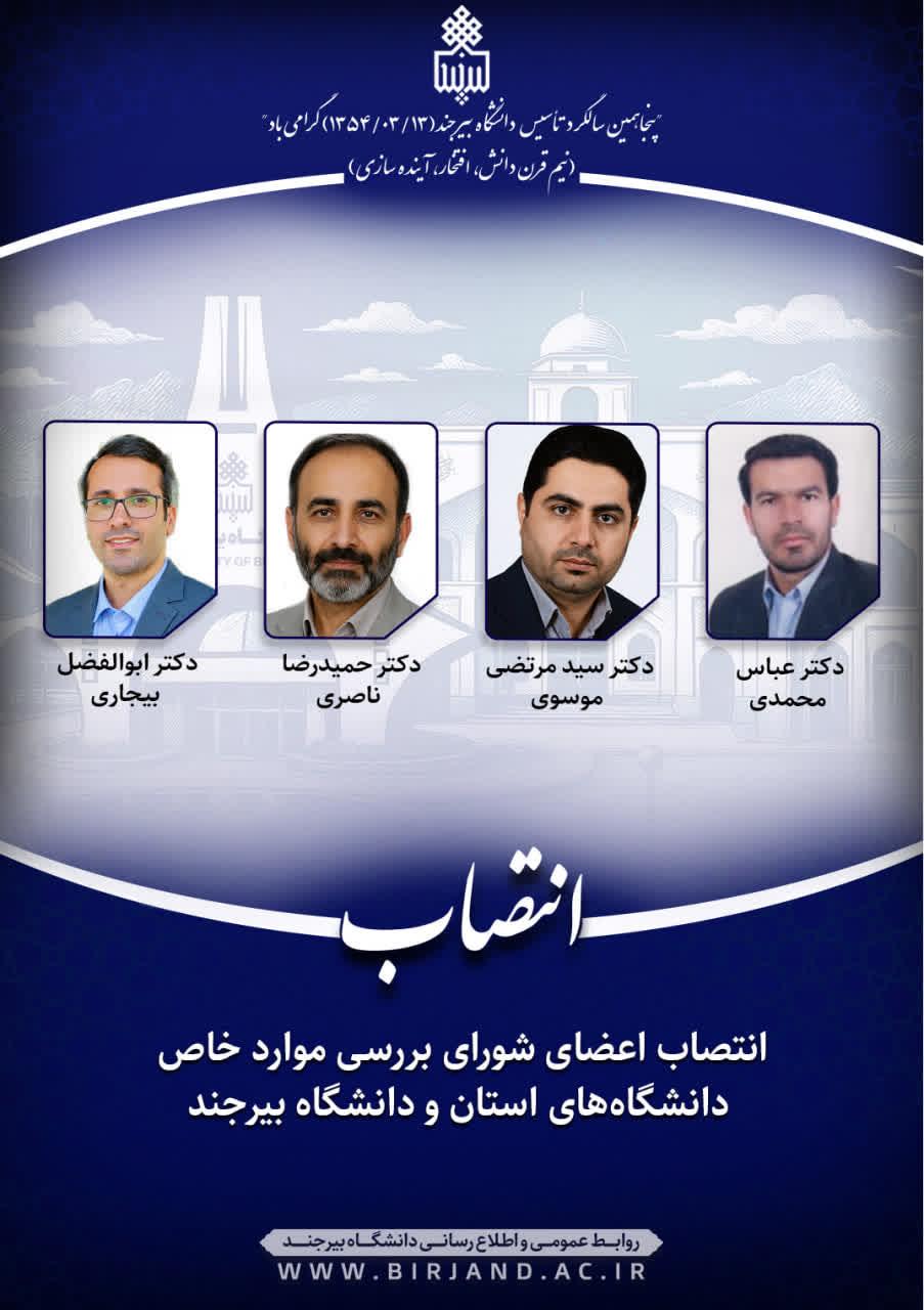 به گزارش روابط عمومی و اطلاعرسانی دانشگاه بیرجند، براساس ابلاغهای انتصاب صادره از سوی سرپرست دانشگاه، دکتر سیدمرتضی موسوی، به سمت عضو شورای بررسی موارد خاص دانشگاههای استان خراسان جنوبی و دکتر عباس محمدی، عضو هیأت علمی گروه آموزشی گیاهپزشکی و دکتر ابوالفضل بیجاری، عضو هیأت علمی گروه مهندسی برق ـ الکترونیک به سمت عضو شورای بررسی موارد خـاص دانشگاه بیرجند به مدت دو سال منصوب شدند.