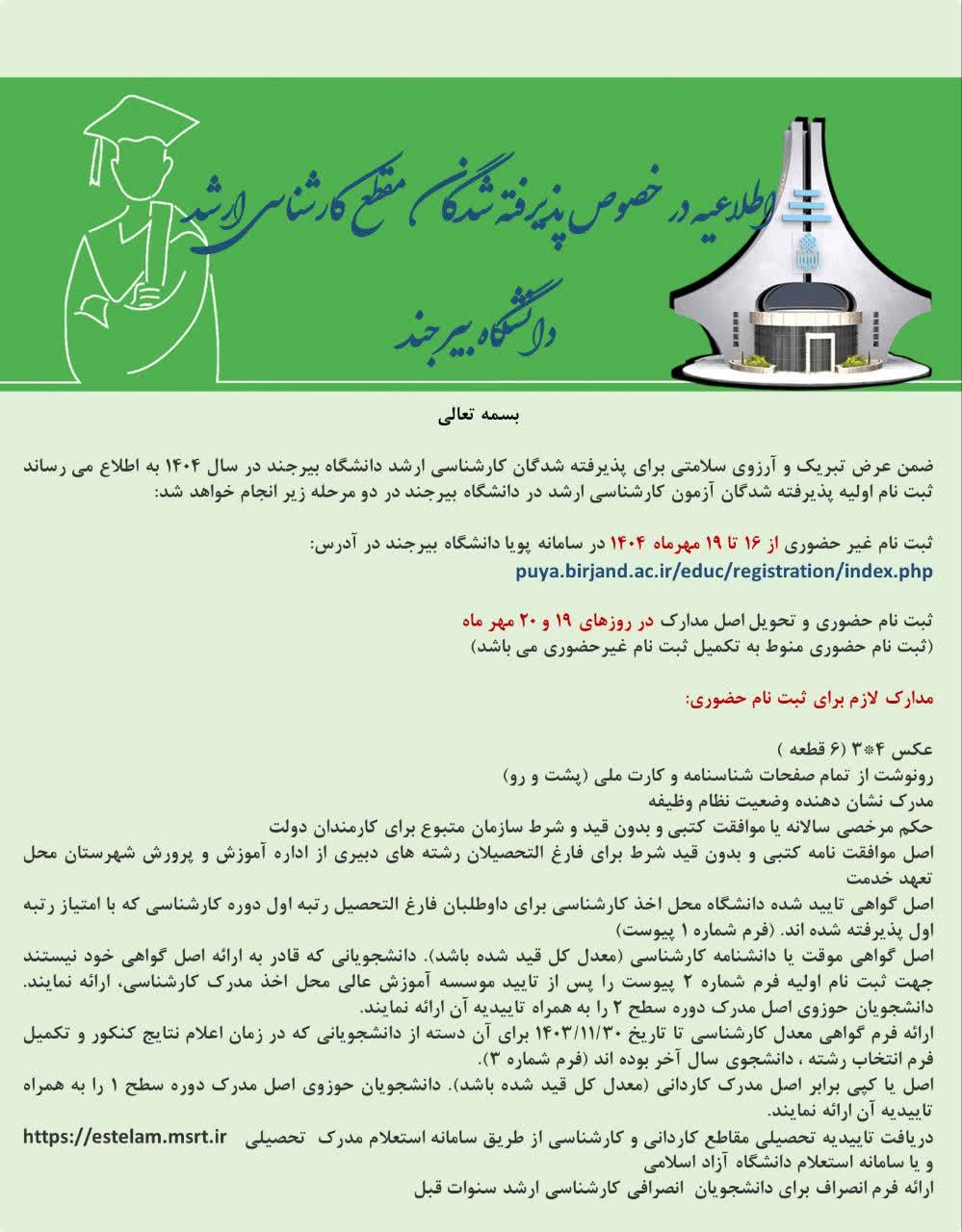 اطلاعیه در خصوص پذیرفته شدگان مقطع کارشناسی ارشد دانشگاه بیرجند ۱۵ مهر ۱۴۰۴ | ۱۳:۰۰ کد : ۳۲۰۲۸ اطلاعیه ها اطلاعیه های مهم ارسال به دیگران نام شما ایمیل شما ایمیل دریافتکننده ارسال انصراف تعداد بازدید:۹۵۵ ضمن تبریک به پذیرفته شدگان کارشناسی ارشد دانشگاه بیرجند در سال ۱۴۰۴ برای اطلاع از فرایند ثبت نام تصویر را مطالعه فرمایید.