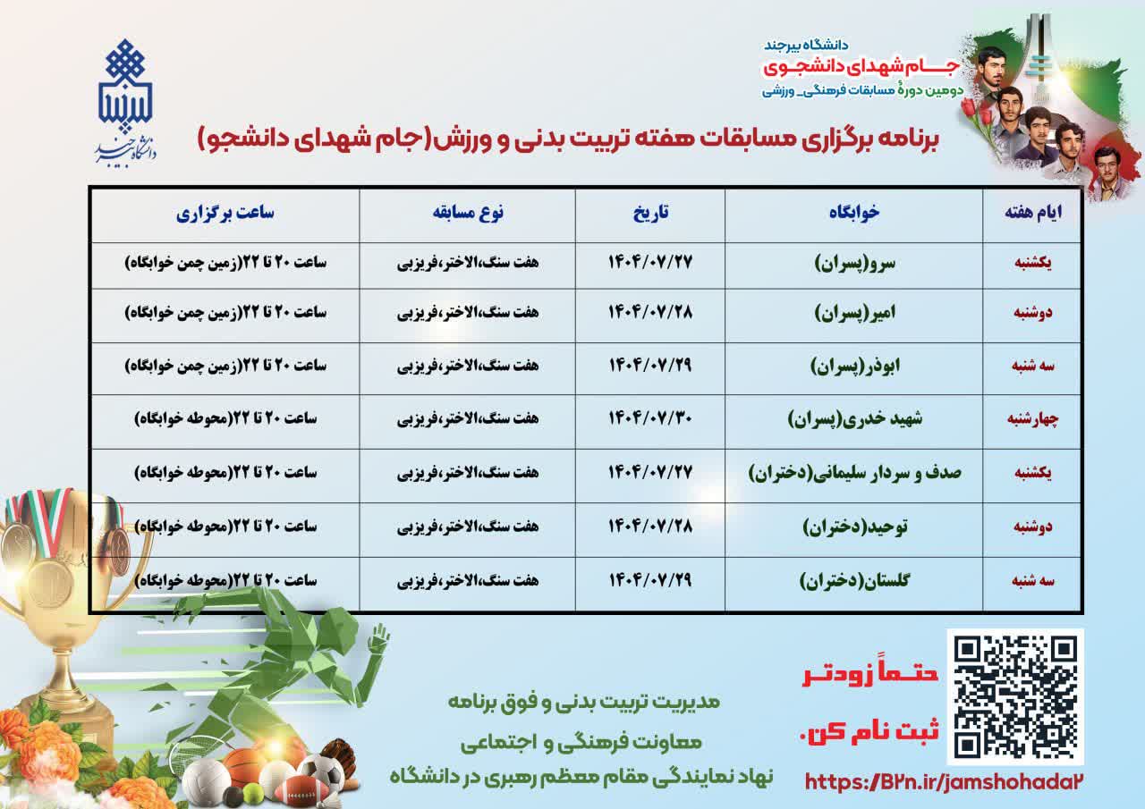 آیین افتتاحیه دومین دوره مسابقات فرهنگی‌ورزشی «جام شهدای دانشجو» به مناسبت هفته تربیت بدنی و ورزش، روز شنبه ۲۶ مهرماه ۱۴۰۴ با حضور جمعی از دانشجویان، اعضای هیأت علمی، کارمندان و مسئولان دانشگاه بیرجند به همت مدیریت تربیت بدنی و فوق‌برنامه و با همکاری معاونت فرهنگی و اجتماعی، و نهاد نمایندگی مقام معظم رهبری در دانشگاه در مجتمع مهتاب برگزار شد.