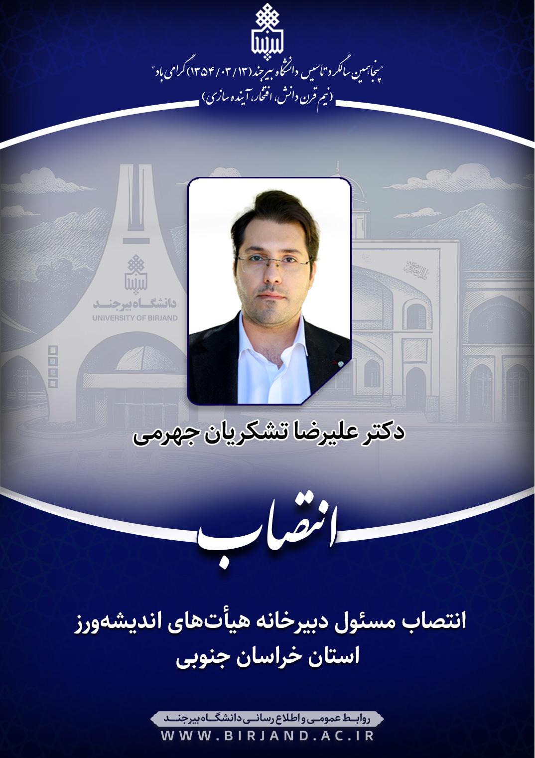 دکتر احمد خامسان، سرپرست دانشگاه بیرجند، طی ابلاغی، دکتر علیرضا تشکریان جهرمی، عضو هیأت علمی گروه آموزشی جامعه شناسی را به عنوان مسئول دبیرخانه هیأت‌های اندیشه‌ورز استان خراسان جنوبی به مدت دو سال منصوب کرد.