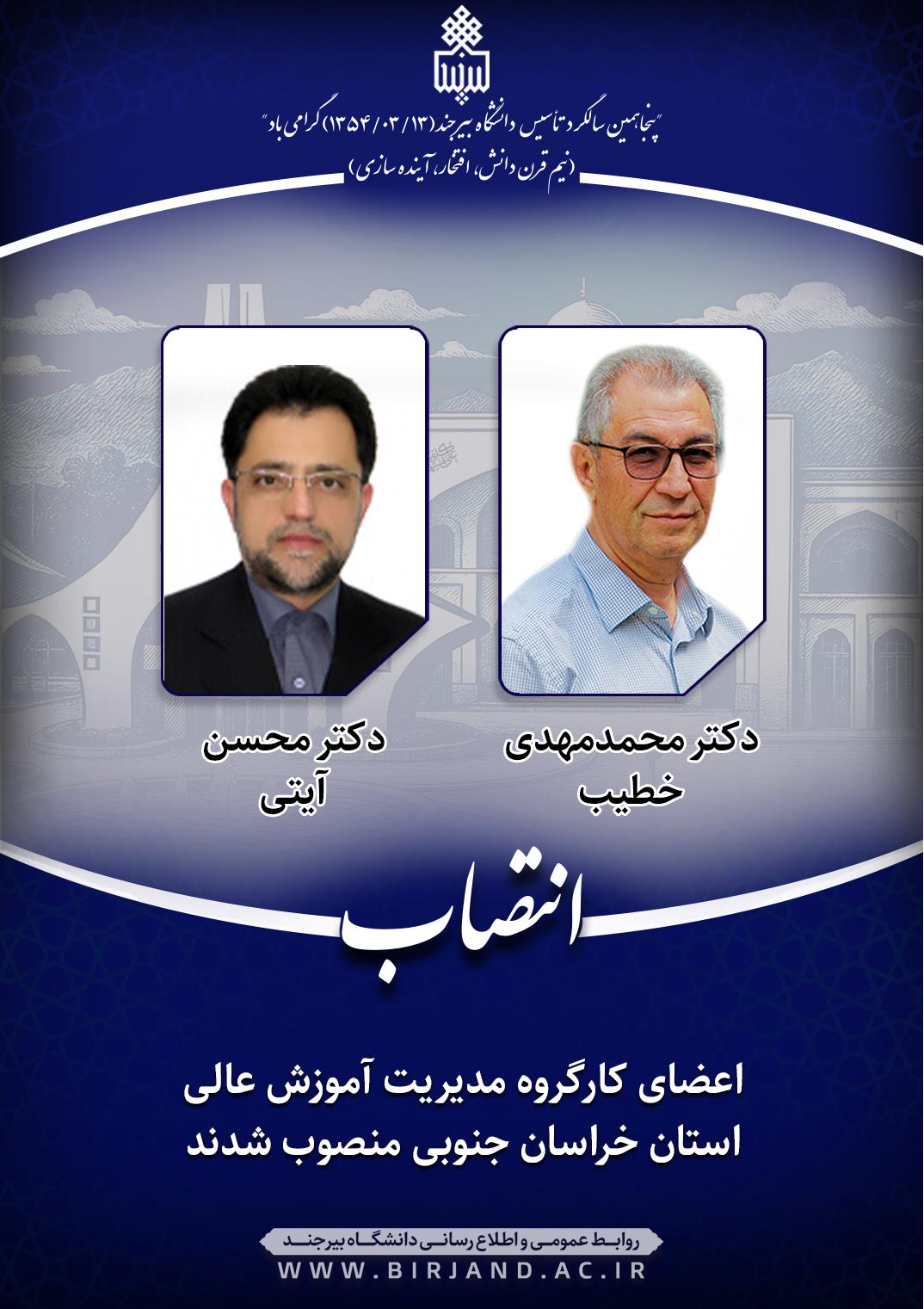 به گزارش روابط عمومی و اطلاع‌رسانی دانشگاه بیرجند، دکتر احمد خامسان، سرپرست دانشگاه طی ابلاغ‌های جداگانه‌ای، دکتر محمدمهدی خطیب، عضو هیأت علمی گروه آموزشی زمین شناسی و دکتر محسن آیتی، هیأت علمی گروه آموزشی علوم تربیتی را به عنوان عضو کارگروه مدیریت آموزش عالی استان خراسان جنوبی به مدت دو سال منصوب کرد.