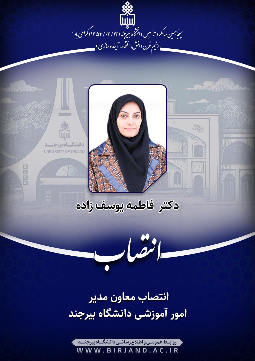 به گزارش روابط و اطلاع‌رسانی دانشگاه بیرجند، در ابلاغ انتصاب دکتر فاطمه یوسف‌زاده آمده است؛ نظر به مراتب تعهـد، تجارب و شایستگی‌های علمی و اجرایی سـرکارعالی، به موجب این ابلاغ و با حفظ سمت آموزشی و پژوهشی، به عنوان معاون مدیر امور آموزشی دانشگاه به مدت دو سال منصوب می‌شویـد. اطمینان دارم با اتکال به خداونـد سـبحان و بهره‌گیری از مشارکت و همفکری همکاران دانشـگاهی، منشاء خدمات ارزنده‌ای خواهید بود. توفیق روزافزون سرکارعالی و اعتلای جایگاه دانشگاه بیرجند را آرزومندم.
