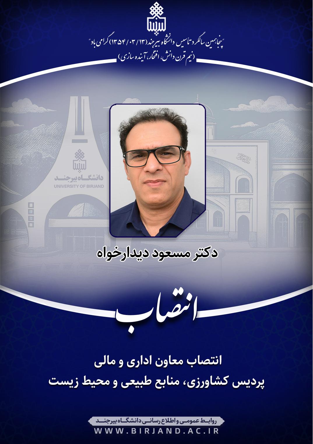 به گزارش روابط عمومی و اطلاع‌رسانی دانشگاه بیرجند، در این ابلاغ انتصاب آمده است؛ نظر به مراتب تعهـد، تجارب و شایستگی‌های علمی و اجرایی جنابعالی، به موجب این ابلاغ و با حفظ سـمت آموزشی و پژوهشی، به عنوان معاون اداری و مالی پردیس کشاورزی، منابع طبیعی و محیط زیست به مدت دو سال منصوب می‌شوید. مقتضـی است ضــمن مطالعه دقیق سند چشم‌انـداز دانشگاه و دانشکده، در خصوص نظـارت بر حسن اجرای آیین‌نـامه‌ها و دســتورالعمل‌های مربوطه با دیگر مسـئولین دانشـکده همکاری لازم مبـذول فرمایید. اطمینان دارم با اتکال به خداوند سـبحان و بهره‌گیری از مشارکت و همفکری همکاران دانشگاهی، منشاء خدمات ارزنده‌ای خواهید بود.